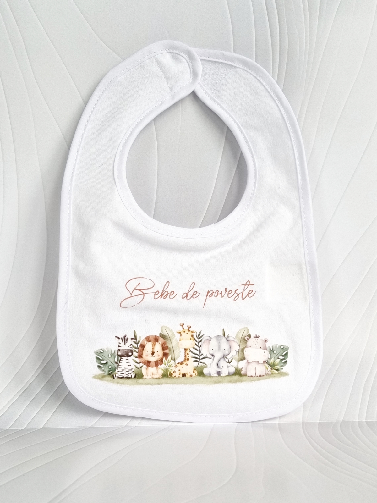 Material fata: bumbac alb – print cu animalute si text “Bebe de poveste”