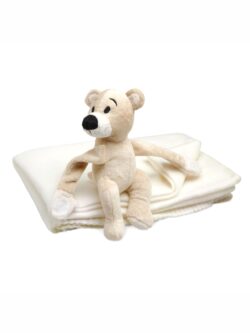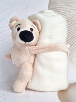Paturica vine cu o jucarie detasabila din plus in forma de ursulet, care tine paturica in brate cu prindere cu scai.