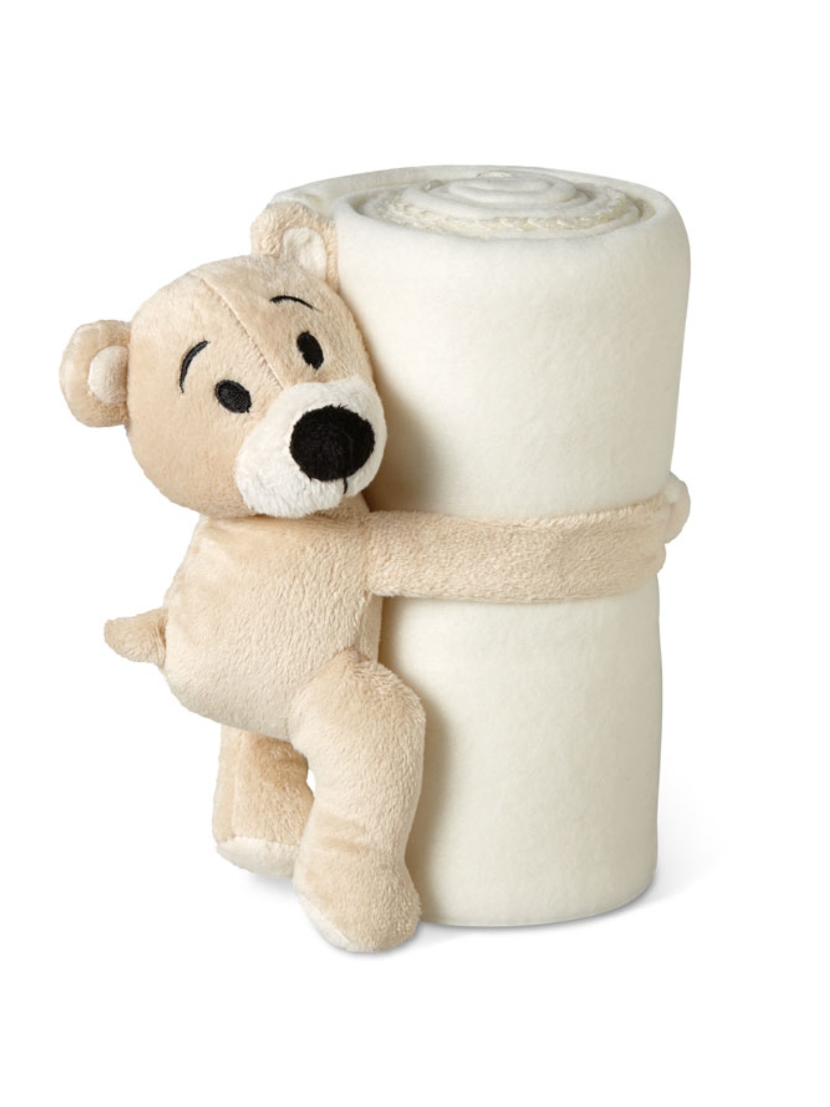 Paturica vine cu o jucarie detasabila din plus in forma de ursulet, care tine paturica in brate cu prindere cu scai.
